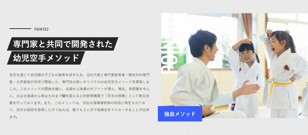 2023.09.01 【正課・空手の授業】について この度、ご紹介させていただくのは「空手の授業」についてです!! 当社では、幼児の発育を促すため、公的機関での「空手の授業」の普及活動を行っています! 現在は北は北海道から、南は九州まで! たくさんの指導現場に携わっております! 当社の研修科目にも制定されており、独自のメソッドをもとに、 幼児空手に重きを置いております!! 空手を仕事に!一緒に空手指導に携わっては見ませんか? 少しでも気になる方はお気軽にエントリーフォームよりご連絡下さい!